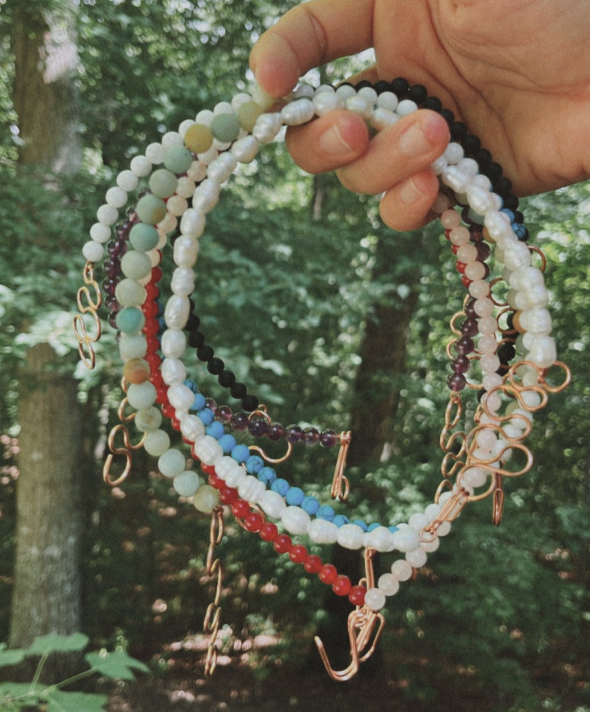 These chokers are unique for several reasons, one being that they are stranded on copper wire instead of the standard elastic. This makes them sturdier as well as increases the energetic flow. They are also made with a funky, elegant, slightly adjustable clasp designed to be both easeful and aesthetically pleasing.